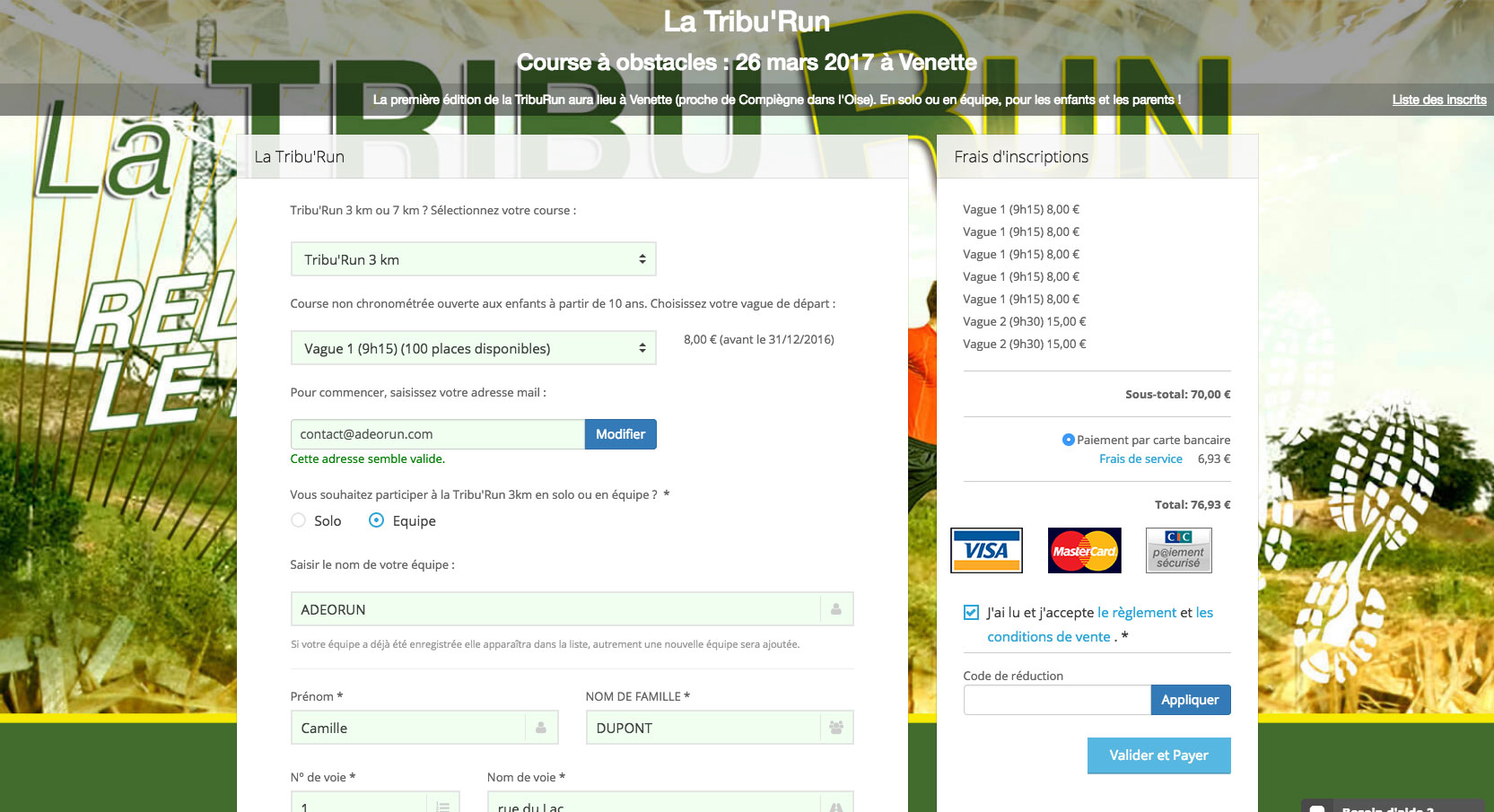 Bravo Clément, exactement 76,93 €. Trouvez ici la réponse à la question : Combien coûterait votre inscription à la TRIBU RUN (frais de service inclus) avant le 31 décembre 2016 si vous inscriviez une équipe de 3 enfants et 2 adultes sur le parcours de 3 km et 2 adultes sur le parcours de 7 km ?