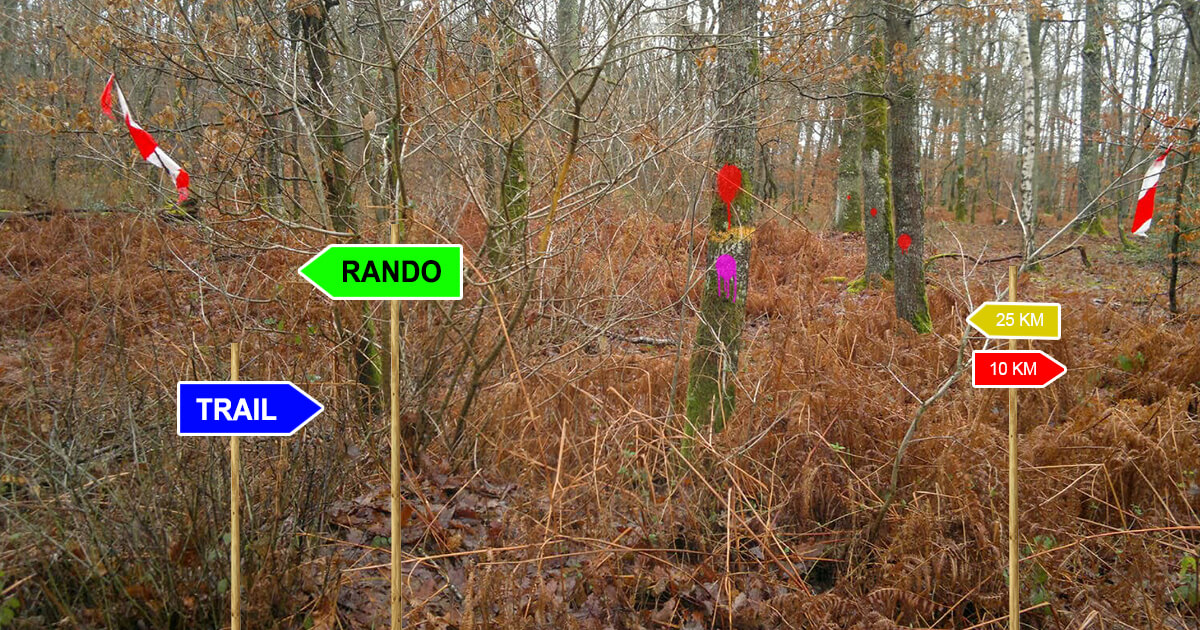 La rubalise se voit bien dans la végétation et, selon la méthode du petit poucet, indique la piste à suivre. Ce type de signalétique ne donne pas de direction à l’avance, elle indique aux coureurs le point vers lequel il doit se diriger : il faut donc accrocher la rubalise de façon à ce qu’elle soit rapidement détectée par le coureur (autant vous dire que ce n’est pas le support le plus efficace pour les trails nocturnes). Pour les courses de nocturnes, pensez au balisage de nuit ! il existe des rubalises réfléchissantes, souvent vendues comme des rouleaux de scotchs phosphorescents : ces signalétiques peuvent être vues de très loin dans l’halo de la lampe frontale.