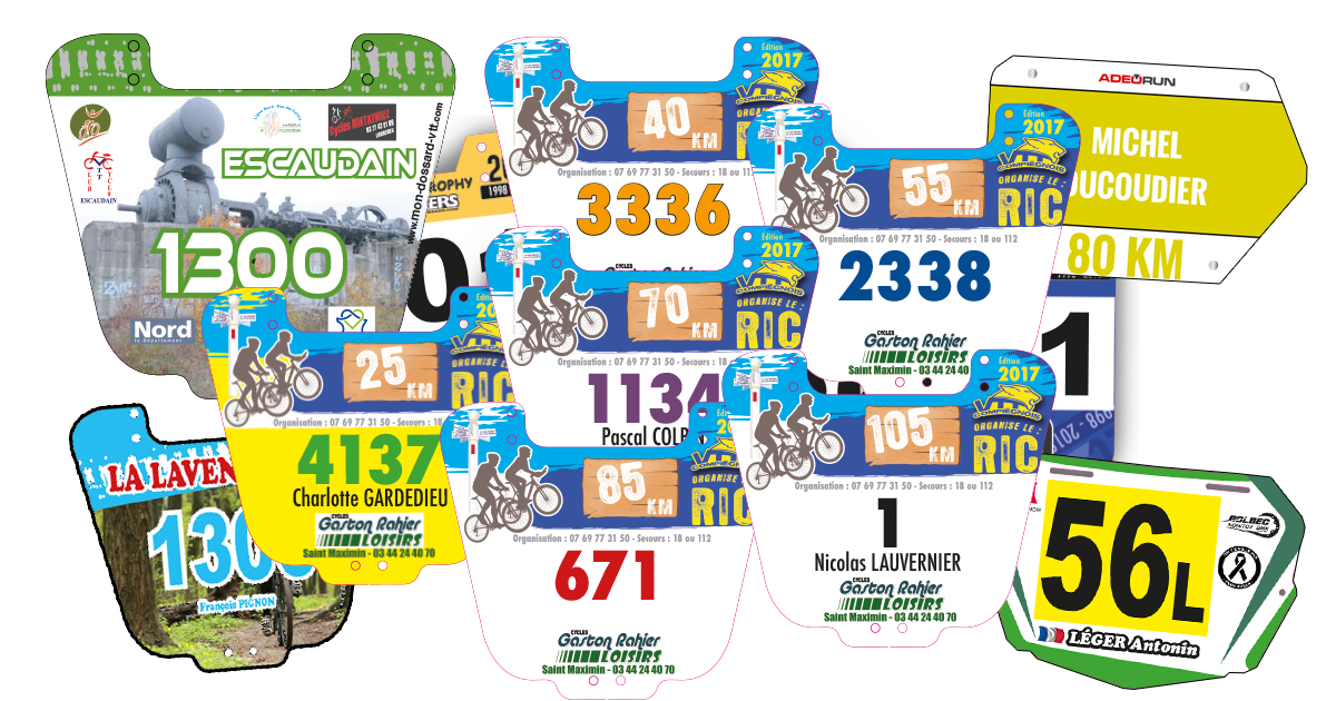 C’est le type de plaques que l’on trouve sur la plupart des randos VTT en France. Souvent personnalisées aux couleurs de l’événement, numérotées par circuit et nominatives, elles présentent de nombreux avantages que nous vous proposons de découvrir ci-dessous. Les plaques de cadre ou les dossards de cycliste sont très rarement utilisés sur les randos VTT, elles sont obligatoires par contre sur les épreuves FFC ou les courses par étapes, avec en complément le dossard de cycliste placé sur l’arrière du maillot.