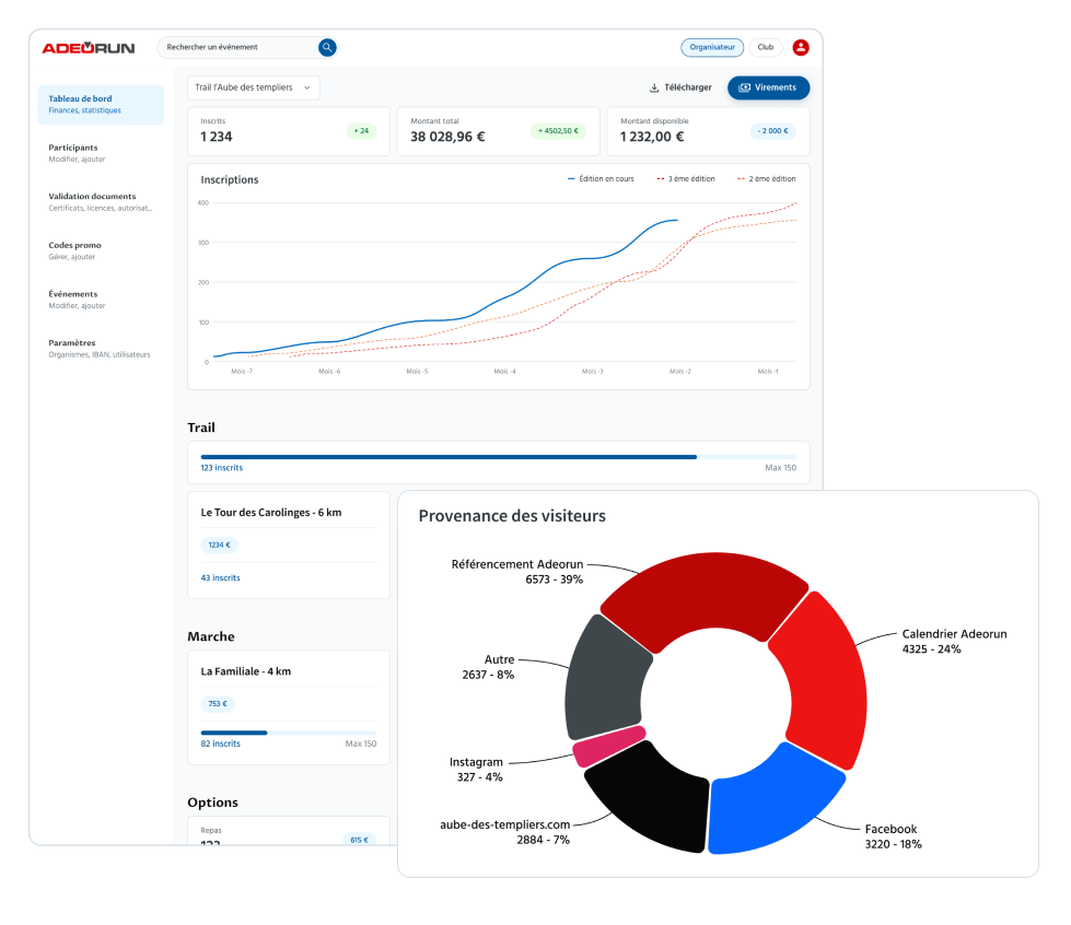 Sur votre espace organisateur vous retrouvez toutes les statistiques détaillées de vues sur votre page, d’inscriptions et de provenance de vos participants.